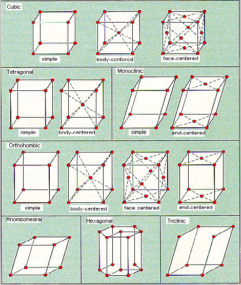 There are a total of 14 possible unit cells into which crystals can be divided, known as Bravais unit cells, shown below in Figure \(\PageIndex{3}\).