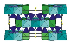 Figure \(\PageIndex{6}\) below demonstrates the layered crystal lattice of the amphibole class of asbestos. The silica tetrahedreals are shown in dark blue and the cation octahedrals are shown in shades of light blue and green. Yellow and gray balls indicate other ions and hydroxide groups that may be present within the crystal.