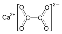 Many of the most toxic chemicals are found in plants. An example of a toxic plant chemical is the oxalic acid (or calcium oxalate, see Figure below), found in rhubarb, spinach, agave, kiwi, and several other fruits and vegetables. Spinach and rhubarb are toxic (in very high doses) because the oxalate inhibits cellular energy production and forms crystals in the kidneys (kidney stones), sometimes causing renal failure. Since oxalate bonds to calcium (Ca) strongly, high oxalate levels can lead to calcium deficiency. A fatal dose of oxalate is 1500 mg, and spinach has 600 mg/100 g (dry weight), peanuts 150 mg/100 g, rhubarb 500 mg/100g (much higher in leaves), and a cup of tea 50 mg.[2]