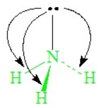 The lone-pair - bond-pair repulsions, being stronger than bond-pair repulsions, cause all H—N—H angles to close down from the ideal 109.5o of the tetrahedron, becoming ~107o in ammonia.