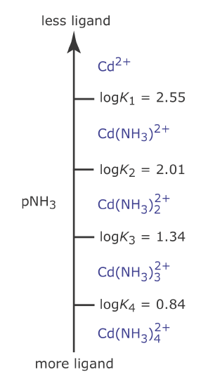 We can apply the same principles for constructing and interpreting an acid–base ladder diagram to equilibria that involve metal–ligand complexes. For a complexation reaction we define the ladder diagram’s scale using the concentration of uncomplexed, or free ligand, pL. Using the formation of \(\text{Cd(NH}_3)^{2+}\) as an example