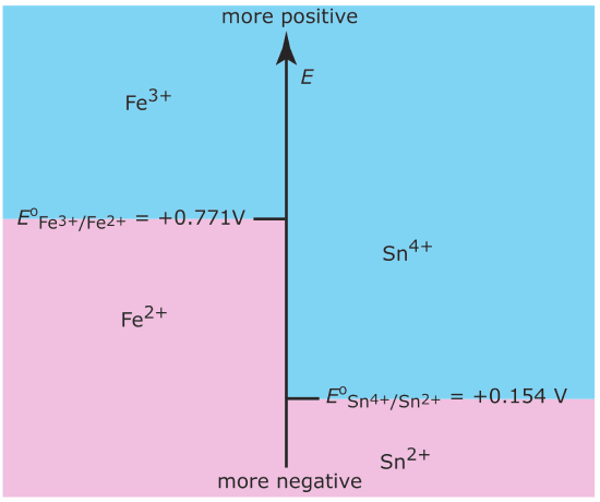 At a potential more positive than the standard state potential, the predominate species is Fe3+, whereas Fe2+ predominates at potentials more negative than Eo. When coupled with the step for the Sn4+/Sn2+ half‐reaction we see that Sn2+ is a useful reducing agent for Fe3+. If Sn2+ is in excess, the potential of the resulting solution is near +0.154 V.