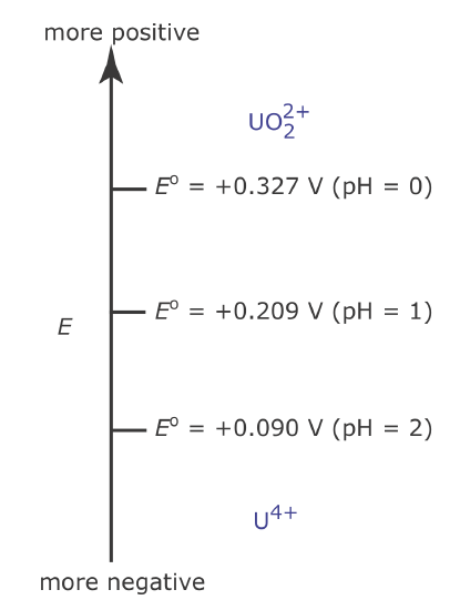 \[\mathrm{UO}_{2}^{2+}(a q)+4 \mathrm{H}_{3} \mathrm{O}^{+}(a q)+2 e^{-} \rightleftharpoons \mathrm{U}^{4+}(a q)+6 \mathrm{H}_{2} \mathrm{O}(l) \nonumber\]
