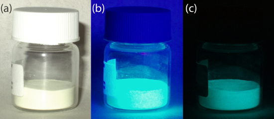 Because the average lifetime for phosphorescence can be quite long, ranging from 10–4–104 s, the phosphorescent quantum yield usually is quite small. An improvement in \(\Phi_p\) is realized by decreasing the efficiency of external conversion. This is accomplished in several ways, including lowering the temperature, using a more viscous solvent, depositing the sample on a solid substrate, or trapping the molecule in solution. Figure 10.6.4 shows an example of phosphorescence.