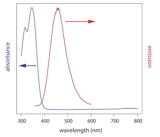 In an emission spectrum a fixed wavelength is used to excite the sample and the intensity of emitted radiation is monitored as function of wavelength. Although a molecule has a single excitation spectrum, it has two emission spectra, one for fluorescence and one for phosphorescence. Figure 10.6.5 shows the UV absorption spectrum and the UV fluorescence emission spectrum for quinine.