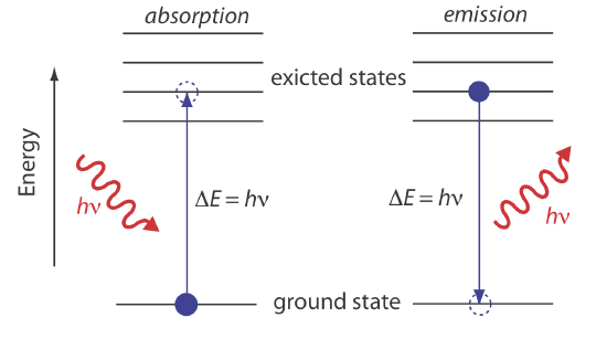 In absorption spectroscopy a photon is absorbed by an atom or molecule, which undergoes a transition from a lower-energy state to a higher-energy, or excited state (Figure 10.1.4 ). The type of transition depends on the photon’s energy. The electromagnetic spectrum in Figure 10.1.3 , for example, shows that absorbing a photon of visible light promotes one of the atom’s or molecule’s valence electrons to a higher-energy level. When an molecule absorbs infrared radiation, on the other hand, one of its chemical bonds experiences a change in vibrational energy.
