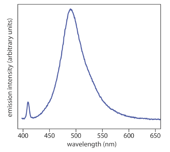When an atom or molecule in an excited state returns to a lower energy state, the excess energy often is released as a photon, a process we call emission (Figure 10.1.4 ). There are several ways in which an atom or a molecule may end up in an excited state, including thermal energy, absorption of a photon, or as the result of a chemical reaction. Emission following the absorption of a photon is also called photoluminescence, and that following a chemical reaction is called chemiluminescence. A typical emission spectrum is shown in Figure 10.1.6 .