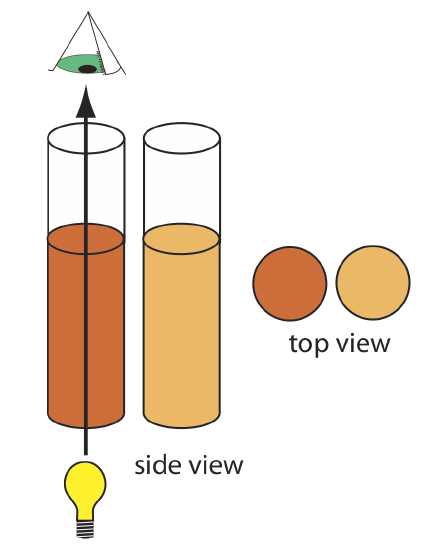 In Nessler’s original colorimetric method for ammonia, which was described at the beginning of the chapter, the sample and several standard solutions of ammonia are placed in separate tall, flat-bottomed tubes. As shown in Figure 10.1.9 , after adding the reagents and allowing the color to develop, the analyst evaluates the color by passing ambient light through the bottom of the tubes and looking down through the solutions. By matching the sample’s color to that of a standard, the analyst is able to determine the concentration of ammonia in the sample.