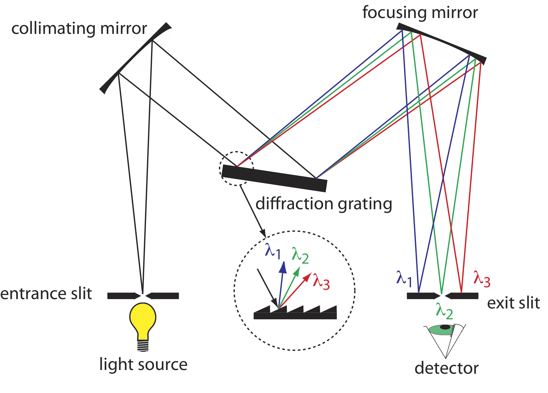 Radiation exits the monochromator and passes to the detector. As shown in Figure 10.1.12 , a monochromator converts a polychromatic source of radiation at the entrance slit to a monochromatic source of finite effective bandwidth at the exit slit. The choice of which wavelength exits the monochromator is determined by rotating the diffraction grating. A narrower exit slit provides a smaller effective bandwidth and better resolution than does a wider exit slit, but at the cost of a smaller throughput of radiation.