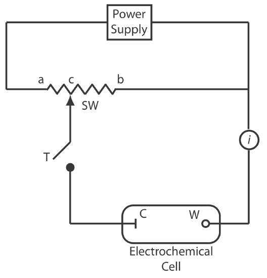 where Ecell is the potential difference between the working electrode and the counter electrode, and Rcb is the resistance between the points c and b of the slide-wire resistor. When iupper = ilower = 0, no current flows through the ammeter and the potential of the electrochemical cell is