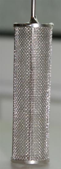 Figure 11.3.3 . Example of a cylindrical Pt-gauze electrode used in controlled-potential coulometry. The electrode shown here has a diameter of 13 mm and a height of 48 mm, and was fashioned from Pt wire with a diameter of approximately 0.15 mm. The electrode’s surface has 360 openings/cm2 and a total surface area of approximately 40 cm2.