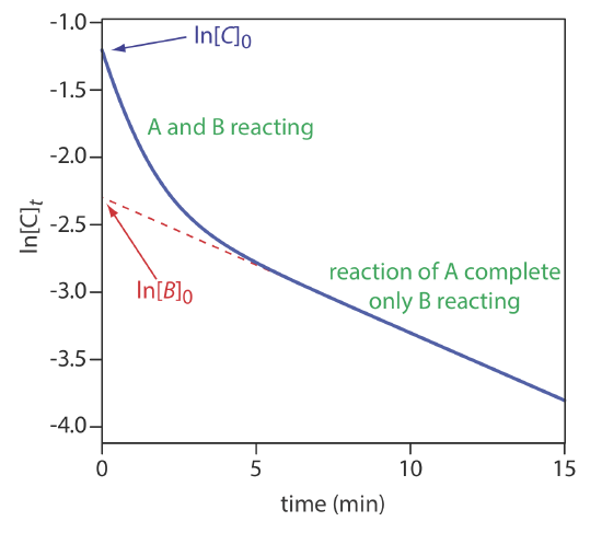 Equation \ref{13.33} can also serve as the basis for a curve-fitting method. As shown in Figure 13.2.15 , a plot of ln(Ct) as a function of time consists of two regions. At shorter times the plot is curved because A and B react simultaneously. At later times, however, the concentration of the faster reacting component, A, decreases to zero, and Equation \ref{13.33} simplifies to