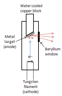 While other sources such as radioisotopes and secondary fluorescence exist, the most common source of X-rays is an X-ray tube. The tube is evacuated and contains a copper block with a metal target anode, and a tungsten filament cathode with a high voltage between them. The filament is heated by a separate circuit, and the large potential difference between the cathode and anode fires electrons at the metal target. The accelerated electrons knock core electrons out of the metal, and electrons in the outer orbitals drop down to fill the vacancies, emitting X-rays. The X-rays exit the tube through a beryllium window. Due to massive amounts of heat being produced in this process, the copper block must usually be water cooled