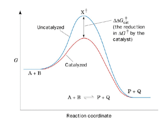 In chemistry, a catalyst is a chemical that drives a reaction forward. Catalysts lower the activation energy, which is the amount of energy required for reactants to form products (Figure 1). Catalysts also lower the kinetic barrier, which is needed to drive a reaction forward and backward. A certain amount of energy contained in the molecules is required when the two molecules react together to form a product. If the two molecules do not have enough energy to react, then no product is produced. By lowering the activation energy, a catalyst allows the molecules to gain sufficient energy to overcome the barrier and form products.