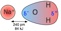 A dipole that is close to a positive or negative ion will orient itself so that the end whose partial charge is opposite to the ion charge will point toward the ion. This kind of interaction is very important in aqueous solutions of ionic substances; H2O is a highly polar molecule, so that in a solution of sodium chloride, for example, the Na+ ions will be enveloped by a shell of water molecules with their oxygen-ends pointing toward these ions, while H2O molecules surrounding the Cl– ions will have their hydrogen ends directed inward. As a consequence of ion-dipole interactions, all ionic species in aqueous solution are hydrated; this is what is denoted by the suffix in formulas such as K+(aq), etc.
