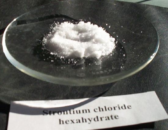 The vapor pressure of this hydrate is 8.4 torr at 25°C. Only at this unique partial pressure of water vapor can the two solids coexist at 25°C. If the partial pressure of water in the air is greater than 8.4 torr, a sample of anhydrous SrCl2 will absorb moisture from the air and change into the hydrate. In fact, when fully hydrates, water is responsible for 40% of the hydrate's mass.