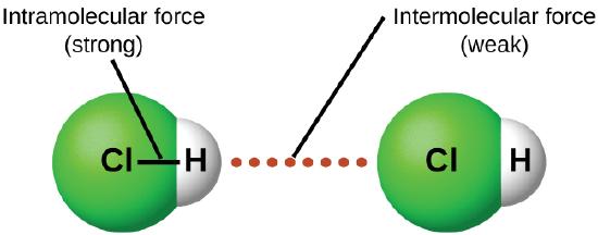 Under appropriate conditions, the attractions between all gas molecules will cause them to form liquids or solids. This is due to intermolecular forces, not intramolecular forces. Intramolecular forces are those within the molecule that keep the molecule together, for example, the bonds between the atoms. Intermolecular forces are the attractions between molecules, which determine many of the physical properties of a substance. Figure \(\PageIndex{4}\) illustrates these different molecular forces. The strengths of these attractive forces vary widely, though usually the IMFs between small molecules are weak compared to the intramolecular forces that bond atoms together within a molecule. For example, to overcome the IMFs in one mole of liquid HCl and convert it into gaseous HCl requires only about 17 kilojoules. However, to break the covalent bonds between the hydrogen and chlorine atoms in one mole of HCl requires about 25 times more energy—430 kilojoules.