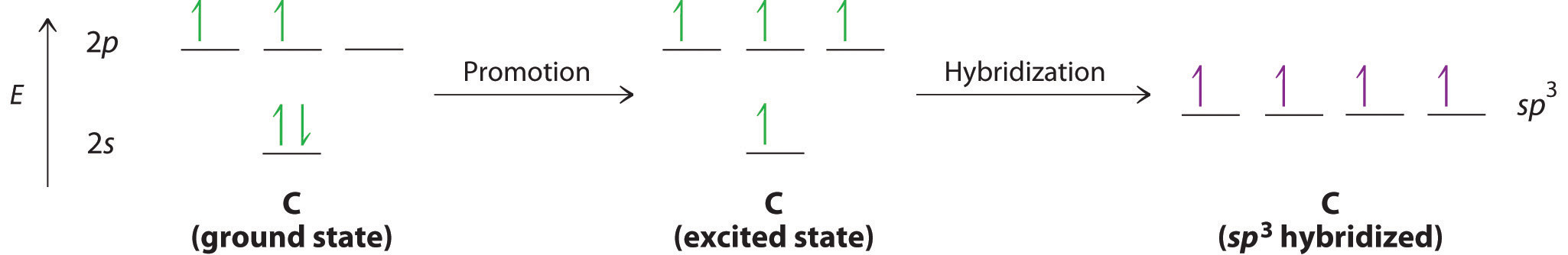 Looking at the 2s22p2 valence electron configuration of carbon, we might expect carbon to use its two unpaired 2p electrons to form compounds with only two covalent bonds. We know, however, that carbon typically forms compounds with four covalent bonds. We can explain this apparent discrepancy by the hybridization of the 2s orbital and the three 2p orbitals on carbon to give a set of four degenerate sp3 (“s-p-three” or “s-p-cubed”) hybrid orbitals, each with a single electron: