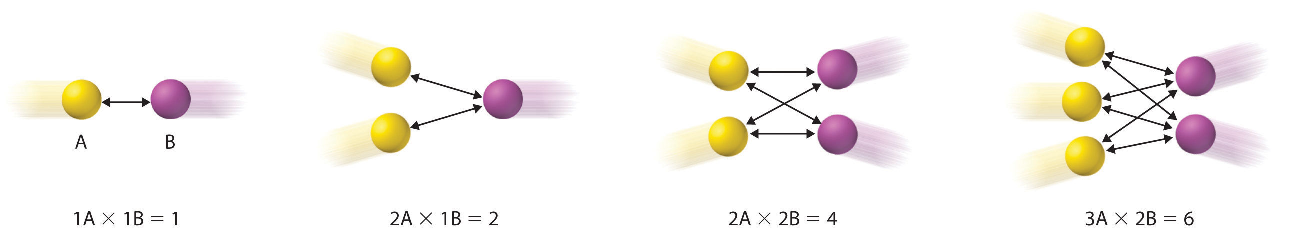 For bimolecular reactions, the reaction rate depends on the number of collisions per unit time, which is proportional to the product of the concentrations of the reactants, as shown in Figure \(\PageIndex{1}\). For a bimolecular elementary reaction of the form A + B → products, the general rate law is