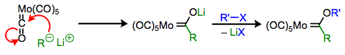 Like the carbonyl carbon in organic compounds, the carbon of ligated CO is often an exquisite electrophile—particularly when the metal is a poor π-base, leaving the carbonyl carbon starved of electrons. CO ligands are susceptible to nucleophilic attack at the carbonyl carbon in the presence of strong nucleophiles. Treating the adduct with an electrophile yields a Fischer carbene complex. If we imagine M=C=O as an analogue of ketene, this reactivity just corresponds to classic nucleophilic addition across the C=O bond.
