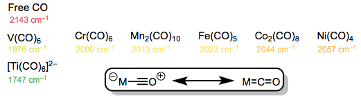 Infrared spectroscopy has famously been used to empirically support the idea of backbonding. The table below arranges some metal carbonyl complexes in “periodic” order and provides the frequency corresponding to the C=O stretching mode. Notice that without exception, every complexed CO has a stretching frequency lower than that of free CO. Backbonding is to blame! The C–O bond order in complexed carbon monoxide is (almost always) lower than that of free CO.