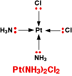 The platinum, the two chlorines, and the two nitrogens are all in the same plane. We will have more to say about cisplatin immediately below.