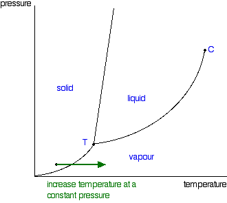 Suppose you had a solid and increased the temperature while keeping the pressure constant - as shown in the next diagram. As the temperature increases to the point where it crosses the line, the solid will turn to liquid. In other words, it melts.