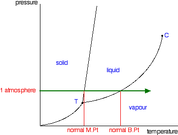 Notice that the triple point for water occurs at a very low pressure. Notice also that the critical temperature is 374°C. It would be impossible to convert water from a gas to a liquid by compressing it above this temperature. The normal melting and boiling points of water are found in exactly the same way as we have already discussed - by seeing where the 1 atmosphere pressure line crosses the solid-liquid and then the liquid-vapor equilibrium lines.