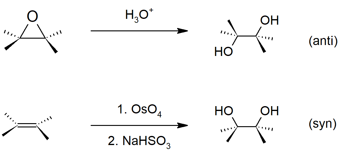 - Diols can be prepared from alkenes by reacting with osmium tetraoxide, then reducing off the osmium to form syn-diols.