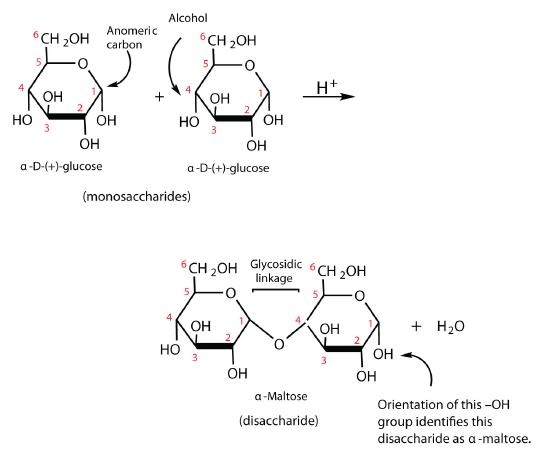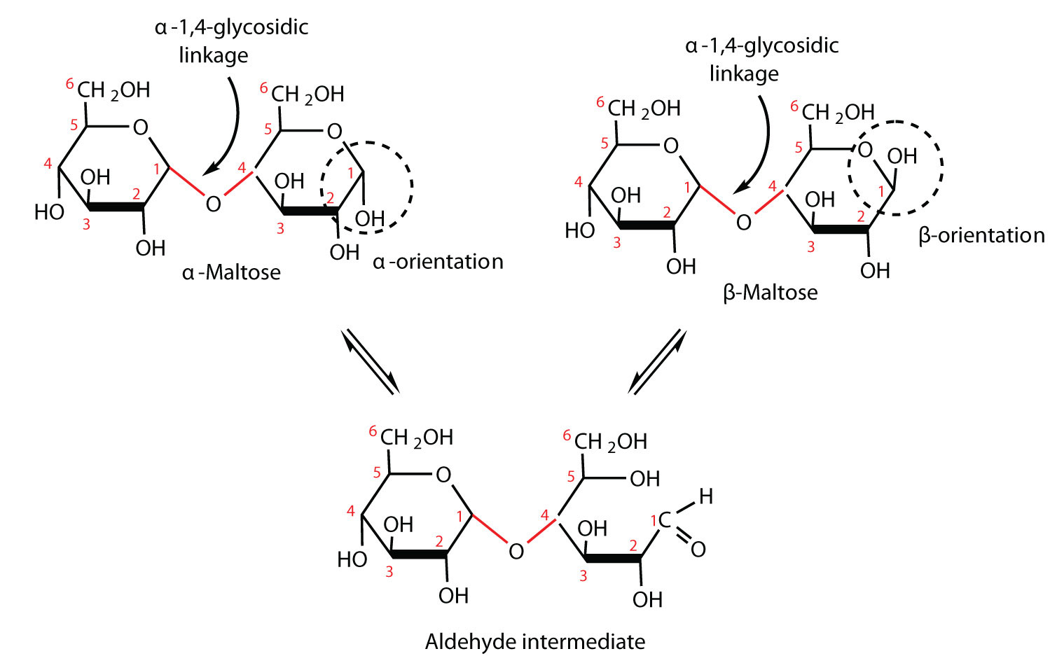 Maltose is a reducing sugar. Thus, its two glucose molecules must be linked in such a way as to leave one anomeric carbon that can open to form an aldehyde group. The glucose units in maltose are joined in a head-to-tail fashion through an α-linkage from the first carbon atom of one glucose molecule to the fourth carbon atom of the second glucose molecule (that is, an α-1,4-glycosidic linkage; see Figure 1). The bond from the anomeric carbon of the first monosaccharide unit is directed downward, which is why this is known as an α-glycosidic linkage. The OH group on the anomeric carbon of the second glucose can be in either the α or the β position, as shown in Figure 1.