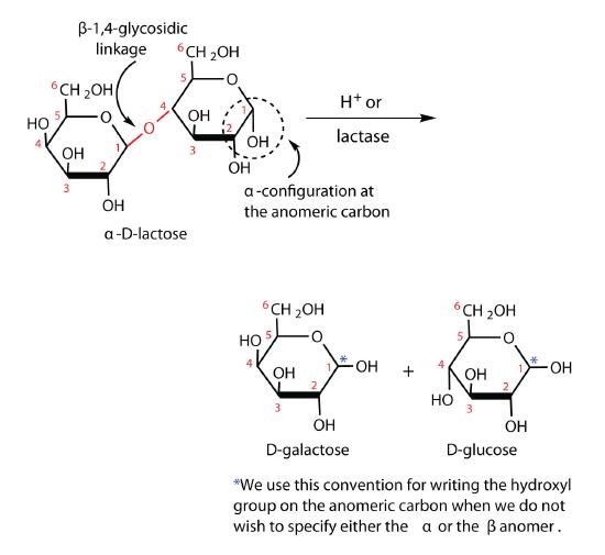Lactose is a reducing sugar composed of one molecule of D-galactose and one molecule of D-glucose joined by a β-1,4-glycosidic bond (the bond from the anomeric carbon of the first monosaccharide unit being directed upward). The two monosaccharides are obtained from lactose by acid hydrolysis or the catalytic action of the enzyme lactase: