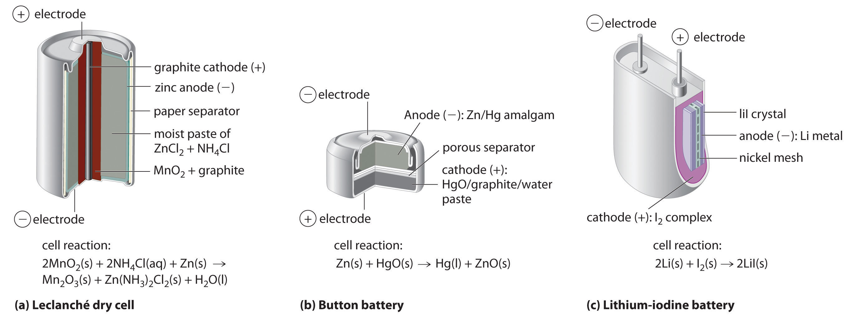 None of the batteries described above is actually “dry.” They all contain small amounts of liquid water, which adds significant mass and causes potential corrosion problems. Consequently, substantial effort has been expended to develop water-free batteries. One of the few commercially successful water-free batteries is the lithium–iodine battery. The anode is lithium metal, and the cathode is a solid complex of \(I_2\). Separating them is a layer of solid \(LiI\), which acts as the electrolyte by allowing the diffusion of Li+ ions. The electrode reactions are as follows: