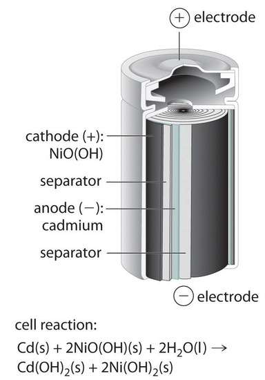 The nickel–cadmium, or NiCad, battery is used in small electrical appliances and devices like drills, portable vacuum cleaners, and AM/FM digital tuners. It is a water-based cell with a cadmium anode and a highly oxidized nickel cathode that is usually described as the nickel(III) oxo-hydroxide, NiO(OH). As shown in Figure \(\PageIndex{2}\), the design maximizes the surface area of the electrodes and minimizes the distance between them, which decreases internal resistance and makes a rather high discharge current possible.