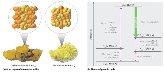 Figure 18.4.3 Two Forms of Elemental Sulfur and a Thermodynamic Cycle Showing the Transition from One to the Other (a) Orthorhombic sulfur (Sα) has a highly ordered structure in which the S8 rings are stacked in a “crankshaft” arrangement. Monoclinic sulfur (Sβ) is also composed of S8 rings but has a less-ordered structure. (b) At 368.5 K, Sα undergoes a phase transition to Sβ. Although ΔS3 cannot be measured directly, it can be calculated using the values shown in this thermodynamic cycle.