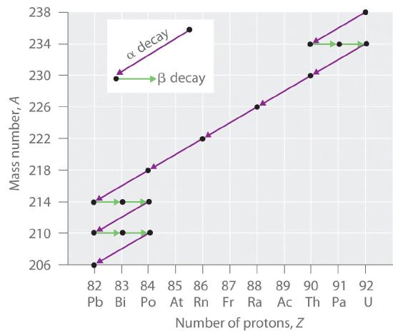 - An unstable element undergoes two different decay reactions: beta decay to produce a material with a mass of 222 amu and alpha decay to astatine.