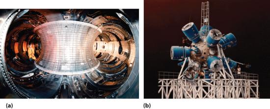 Although nuclear fusion reactions, such as those in Equation 24.4.12 and Equation 24.4.13, are thermodynamically spontaneous, the positive charge on both nuclei results in a large electrostatic energy barrier to the reaction. (As you learned in Chapter 18 , thermodynamic spontaneity is unrelated to the reaction rate.) Extraordinarily high temperatures (about 1.0 × 108°C) are required to overcome electrostatic repulsions and initiate a fusion reaction. Even the most feasible such reaction, deuterium–tritium fusion (D–T fusion; Equation 24.4.13), requires a temperature of about 4.0 × 107°C. Achieving these temperatures and controlling the materials to be fused are extraordinarily difficult problems, as is extracting the energy released by the fusion reaction, because a commercial fusion reactor would require such high temperatures to be maintained for long periods of time. Several different technologies are currently being explored, including the use of intense magnetic fields to contain ions in the form of a dense, high-energy plasma at a temperature high enough to sustain fusion (part (a) in Figure 24.5.4 ). Another concept employs focused laser beams to heat and compress fuel pellets in controlled miniature fusion explosions (part (b) in Figure 24.5.4 ).
