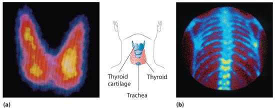 Figure 24.5.5 Medical Imaging and Treatment with Radioisotopes (a) Radioactive iodine is used both to obtain images of the thyroid and to treat thyroid cancer. Injected iodine-123 or iodine-131 is selectively taken up by the thyroid gland, where it is incorporated into the thyroid hormone: thyroxine. Because iodine-131 emits low-energy β particles that are absorbed by the surrounding tissue, it can be used to destroy malignant tissue in the thyroid. In contrast, iodine-123 emits higher-energy γ rays that penetrate tissues readily, enabling it to image the thyroid gland, as shown here. (b) Some technetium compounds are selectively absorbed by cancerous cells within bones. The yellow spots show that a primary cancer has metastasized (spread) to the patient’s spine (lower center) and ribs (right center).