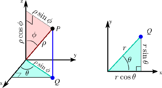 The coordinate \( \theta \) is the angle between the vector r and the z-axis, similar to latitude in geography, but with \( \theta= 0 \) and \( \theta = \pi \) corresponding to the North and South Poles, respectively. The angle \( \phi \) describes the rotation of r about the z-axis, running from 0 to \(2 \pi \), similar to geographic longitude. The volume element in spherical polar coordinates is given by