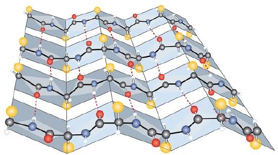 Another common type of secondary structure, called the β-pleated sheet conformation, is a sheetlike arrangement in which two or more extended polypeptide chains (or separate regions on the same chain) are aligned side by side. The aligned segments can run either parallel or antiparallel—that is, the N-terminals can face in the same direction on adjacent chains or in different directions—and are connected by interchain hydrogen bonding (Figure \(\PageIndex{3}\)). The β-pleated sheet is particularly important in structural proteins, such as silk fibroin. It is also seen in portions of many enzymes, such as carboxypeptidase A and lysozyme.