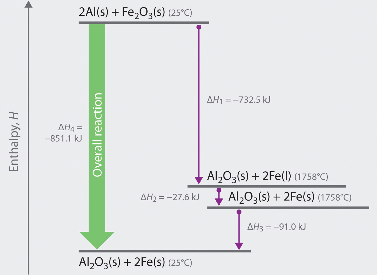 We can illustrate Hess’s law using the thermite reaction. The overall reaction shown in Equation \(\ref{5.6.1}\) can be viewed as occurring in three distinct steps with known ΔH values. As shown in Figure 5.6.1, the first reaction produces 1 mol of solid aluminum oxide (Al2O3) and 2 mol of liquid iron at its melting point of 1758°C (part (a) in Equation \(\ref{5.6.1}\)); the enthalpy change for this reaction is −732.5 kJ/mol of Fe2O3. The second reaction is the conversion of 2 mol of liquid iron at 1758°C to 2 mol of solid iron at 1758°C (part (b) in Equation 5.6.1); the enthalpy change for this reaction is −13.8 kJ/mol of Fe (−27.6 kJ per 2 mol Fe). In the third reaction, 2 mol of solid iron at 1758°C is converted to 2 mol of solid iron at 25°C (part (c) in Equation \(\ref{5.6.1}\)); the enthalpy change for this reaction is −45.5 kJ/mol of Fe (−91.0 kJ per 2 mol Fe). As you can see in Figure 5.6.1, the overall reaction is given by the longest arrow (shown on the left), which is the sum of the three shorter arrows (shown on the right). Adding parts (a), (b), and (c) in Equation 5.6.1 gives the overall reaction, shown in part (d):